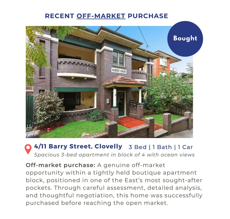 I was engaged by a family who'd been searching for some time, missing out on properties at auction and growing frustrated. They needed space. Three bedrooms minimum. In an apartment setting. They were committed to Clovelly because their oldest son was at school there and they had close friends in the area. They valued ocean access and didn't want to compromise on that.