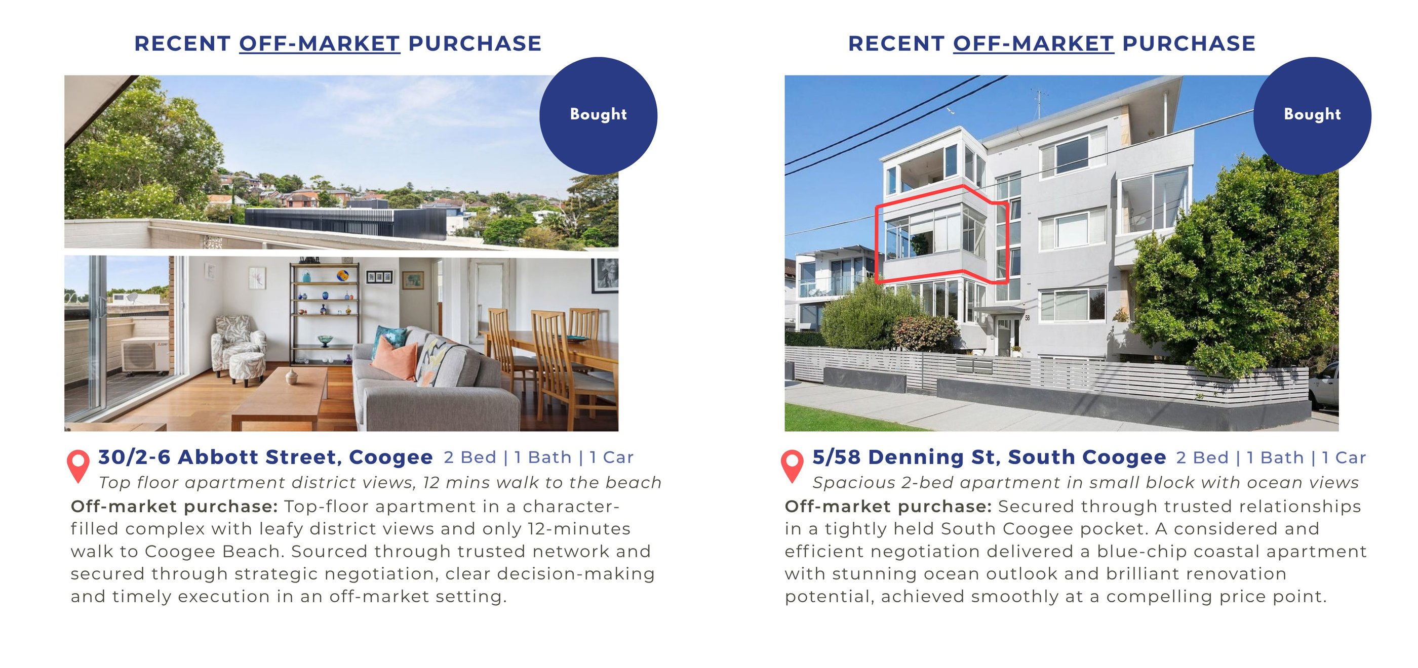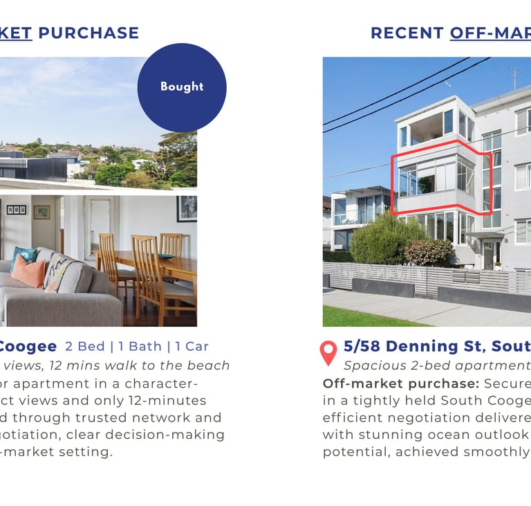 A client came to me through a referral, looking to move closer to the beach with easy access to the city where she works. She had a settlement deadline approaching and needed certainty. An opportunity surfaced through my network, a top-floor apartment in a character-filled complex with district views, available off-market. I was invited to inspect it on a Saturday. That same afternoon, I shared a video with my client. We arranged a private inspection for her on Sunday. We spent Monday working through the details, and by Tuesday we had reached an agreement. The property was secured at a strong price point relative to recent comparable sales in the building.